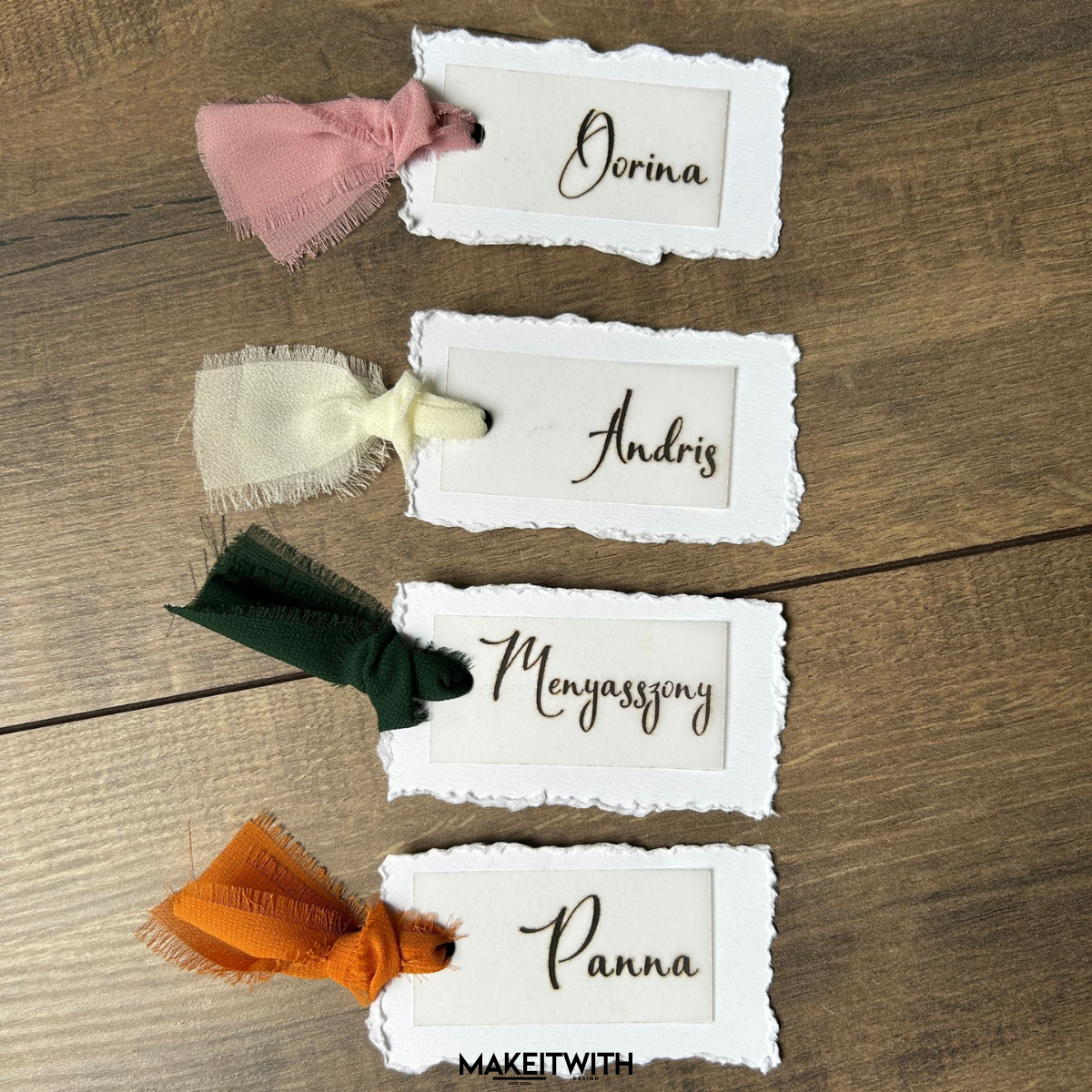 Adj különleges hangulatot az asztalterítésnek ezzel az elegáns ültetőkártyával! A letisztult kézírásos nevek áttetsző pausz papíron jelennek meg, amely finom és modern megjelenést biztosít. A prégelt lap szaggatott széllel egyedi és részletgazdag hatást kelt, míg a kártya mérete (9×5 cm) praktikus és jól látható az asztalon.