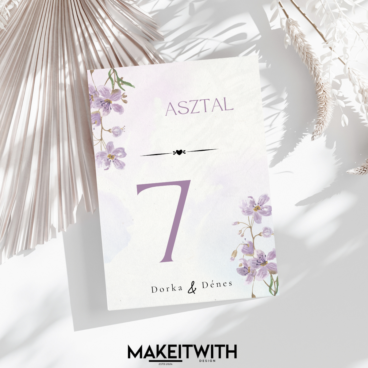 Ez a gyönyörű asztalszám a romantikus lila virágmotívumokkal a természetesség és elegancia tökéletes ötvözete. Tökéletes választás azoknak a pároknak, akik szeretnék, hogy asztalszámuk meghitt, szeretetteljes és stílusos hangulatot sugározzon.