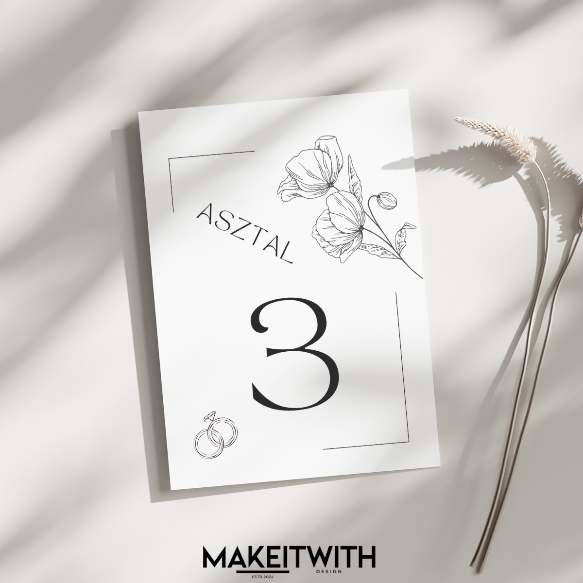 Minimalista, Mákvirágos Esküvői Asztalszám