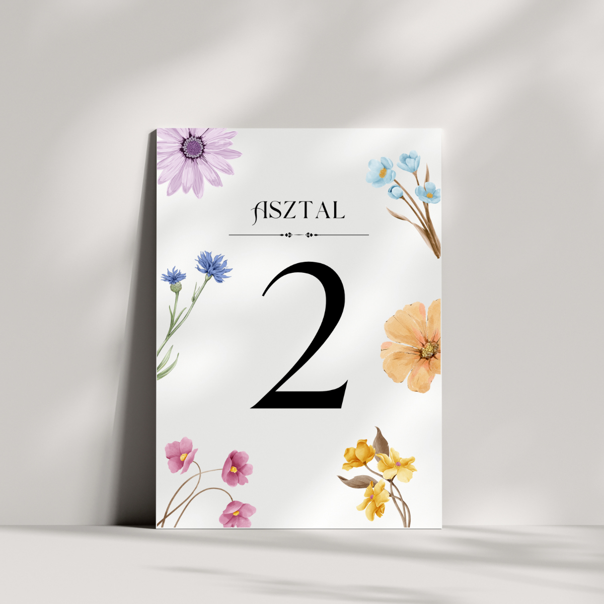 Vidám, színes réti virágos asztalszám, amely frissességet és természetességet sugároz. Tökéletes választás pároknak, akik szeretnék, hogy esküvőjük minden kiegészítője tükrözze a nagy nap örömét és könnyedségét.