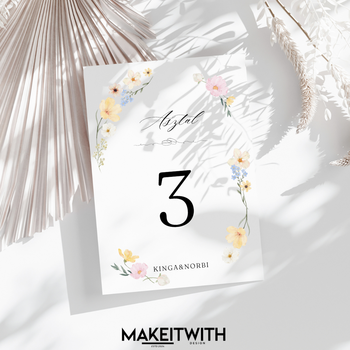 Ez az elegáns esküvői asztalszám a letisztult stílus és a színes virágok harmóniájával tökéletes választás a modern, természetes szépségre vágyó pároknak. A virágos minták friss és vidám hangulatot árasztanak, miközben a minimalista design megőrzi az asztalszám eleganciáját.