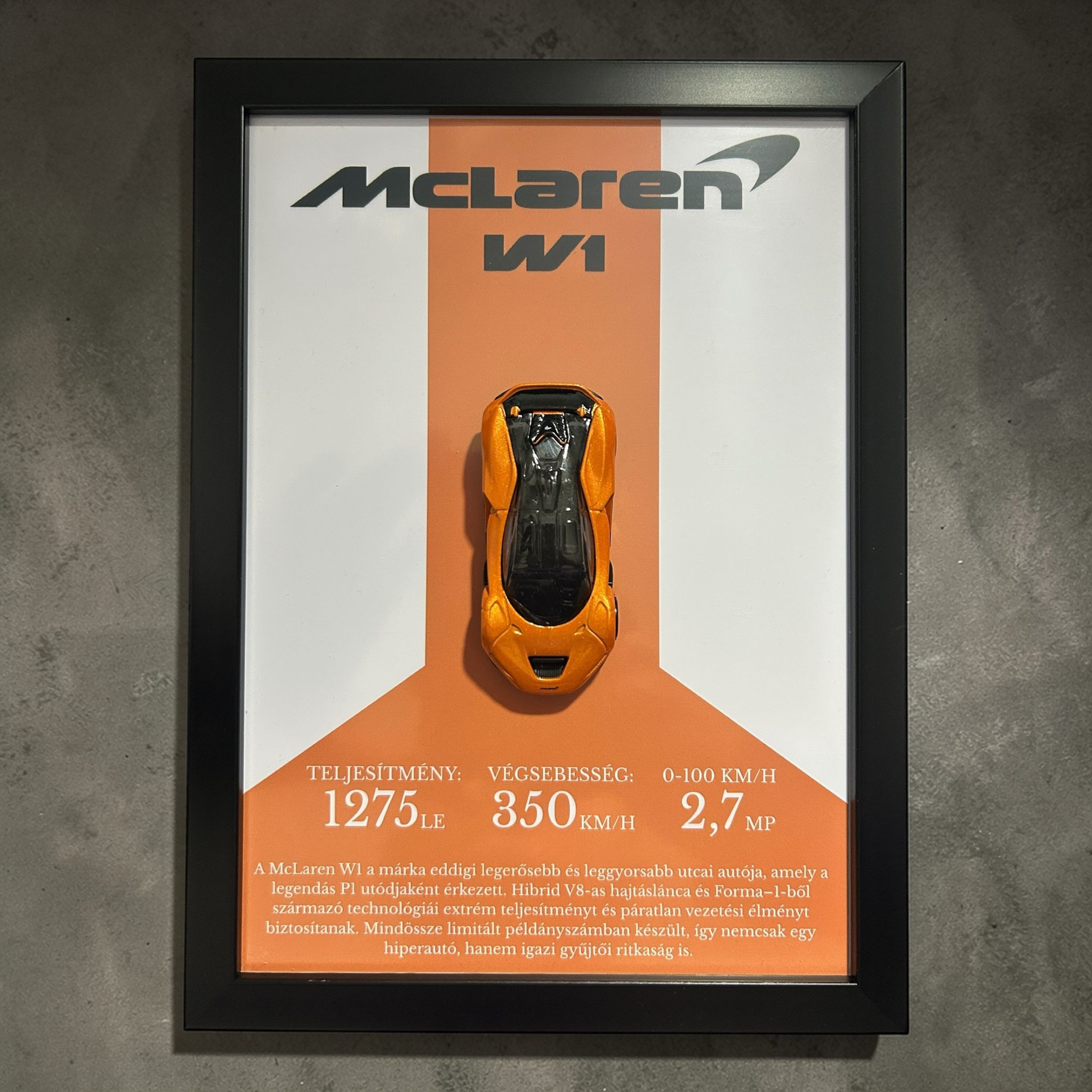 Egyedi McLaren W1 falikép Matchbox modellel, amely tökéletes választás autórajongók számára. A 15×21 cm-es fekete képkeretben elhelyezett, fényes fotópapírra nyomtatott design középpontjában egy miniatűr autó található.