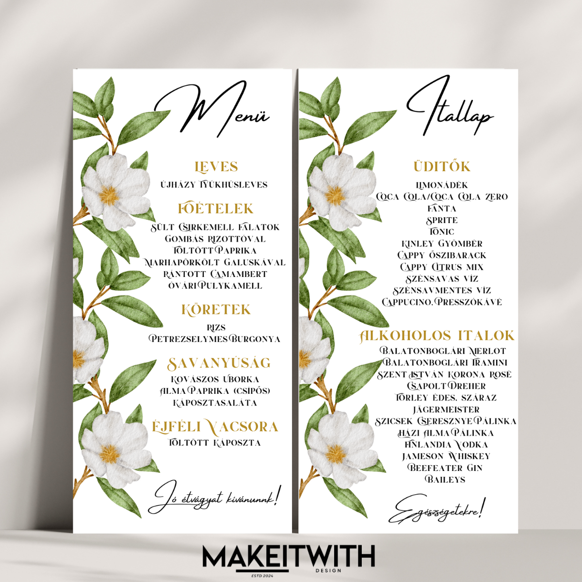 Digitális esküvői csomag, letisztult greenery stílusban, amely margaréta virágokkal és zöld levelekkel ad egy friss, természetes eleganciát a nagy naphoz. A csomag tartalmazza a meghívót, menüt, névtáblát és asztalszámot is, mindegyik a design tökéletes harmóniájában.