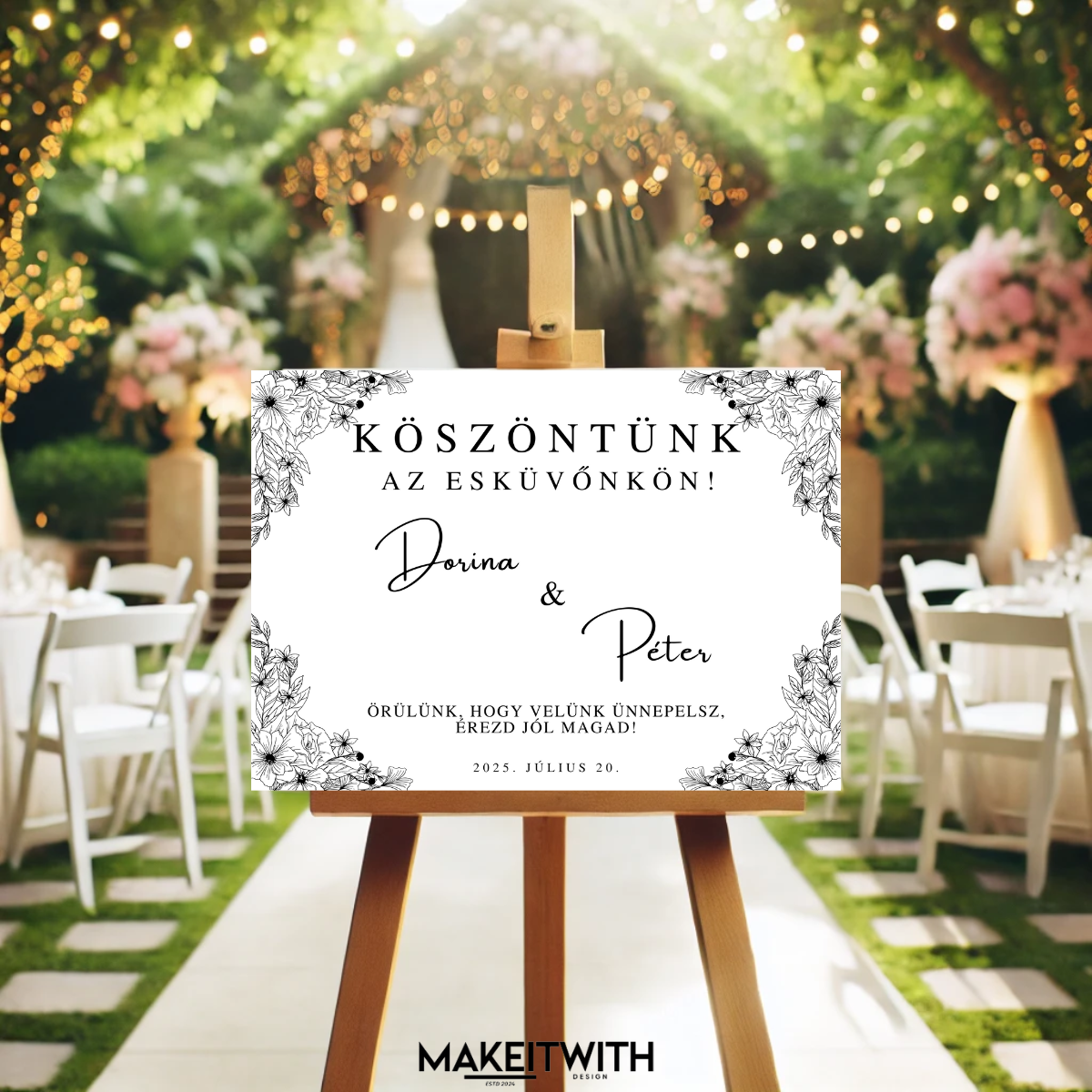 - Digitális esküvői üdvözlő tábla (70×50 cm)