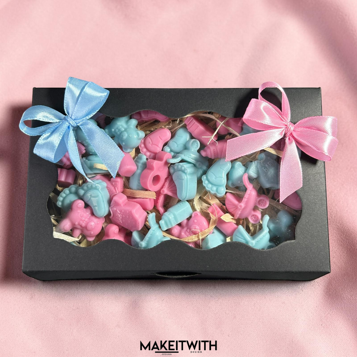 Az illatviaszok egy igényes, ajándékozásra kész díszdobozban érkeznek, amelyet egy rózsaszín és egy kék masni tesz igazán bájossá.