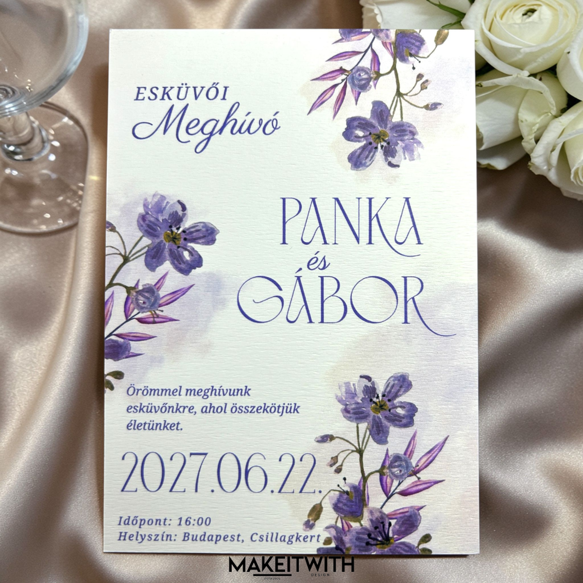 Romantikus, akvarell hatású lila virágokkal díszített esküvői meghívó, amely a letisztult eleganciát ötvözi a természetes szépséggel. A finom tipográfia és a harmonikus elrendezés kifinomult, mégis személyes megjelenést biztosít.