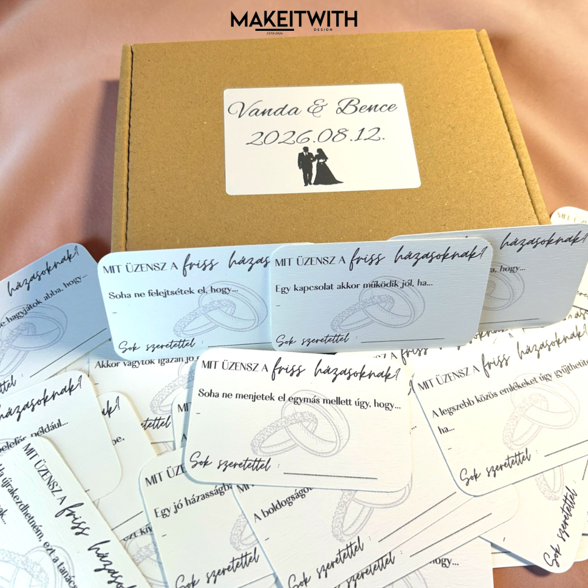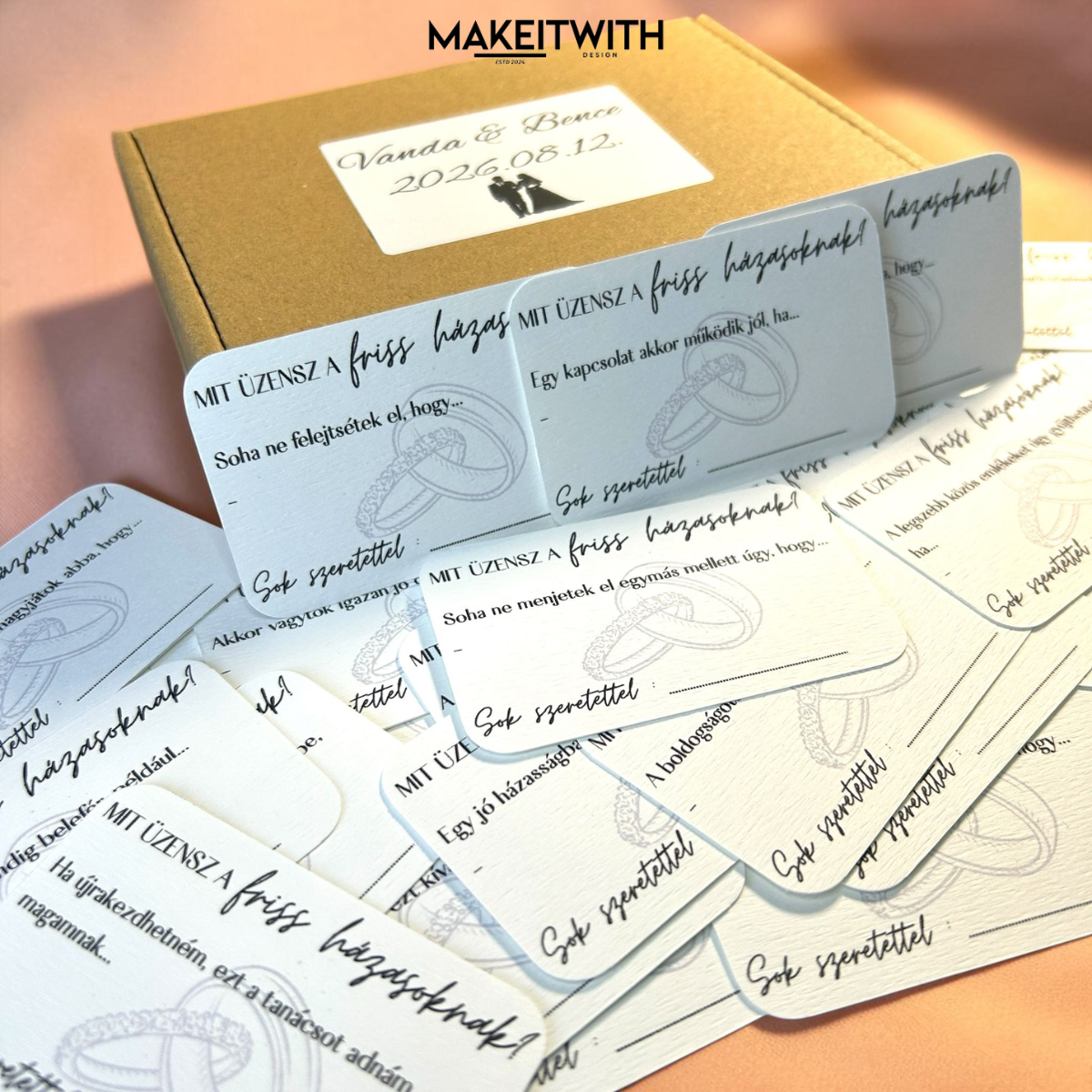 Tedd különlegessé az esküvőt egy interaktív vendégkönyv alternatívával! A kártyákra a vendégek személyes üzeneteket és tanácsokat írhatnak az ifjú párnak, így maradandó emlék születik.