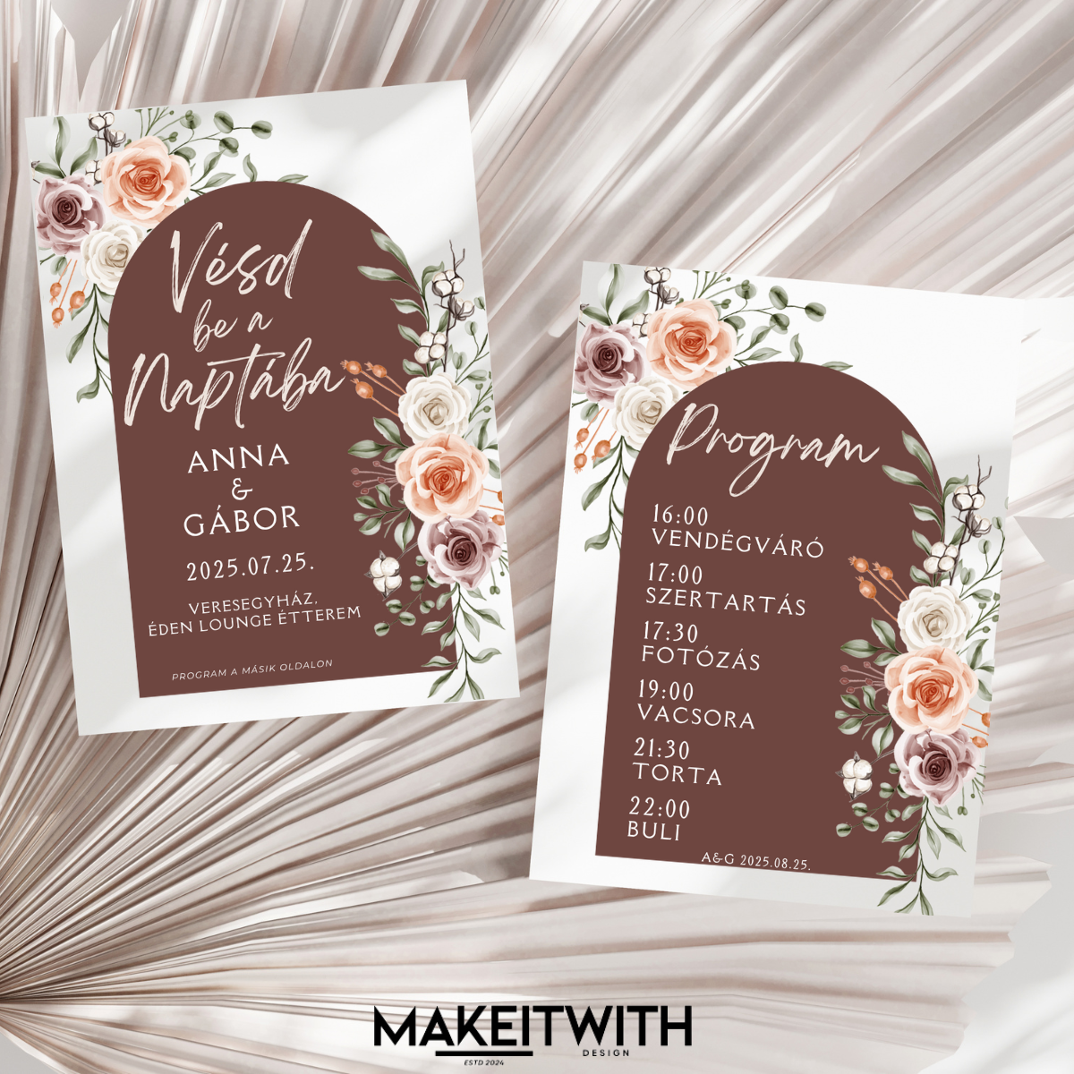 Kétoldalas, elegáns meghívó meleg barna árnyalatú háttérrel és romantikus, vintage stílusú rózsa- és virágmintákkal. A természetes motívumok és a kézírásos hatású betűtípus rusztikus, ugyanakkor kifinomult hangulatot árasztanak. Tökéletes választás romantikus, természetközeli esküvőkhöz.