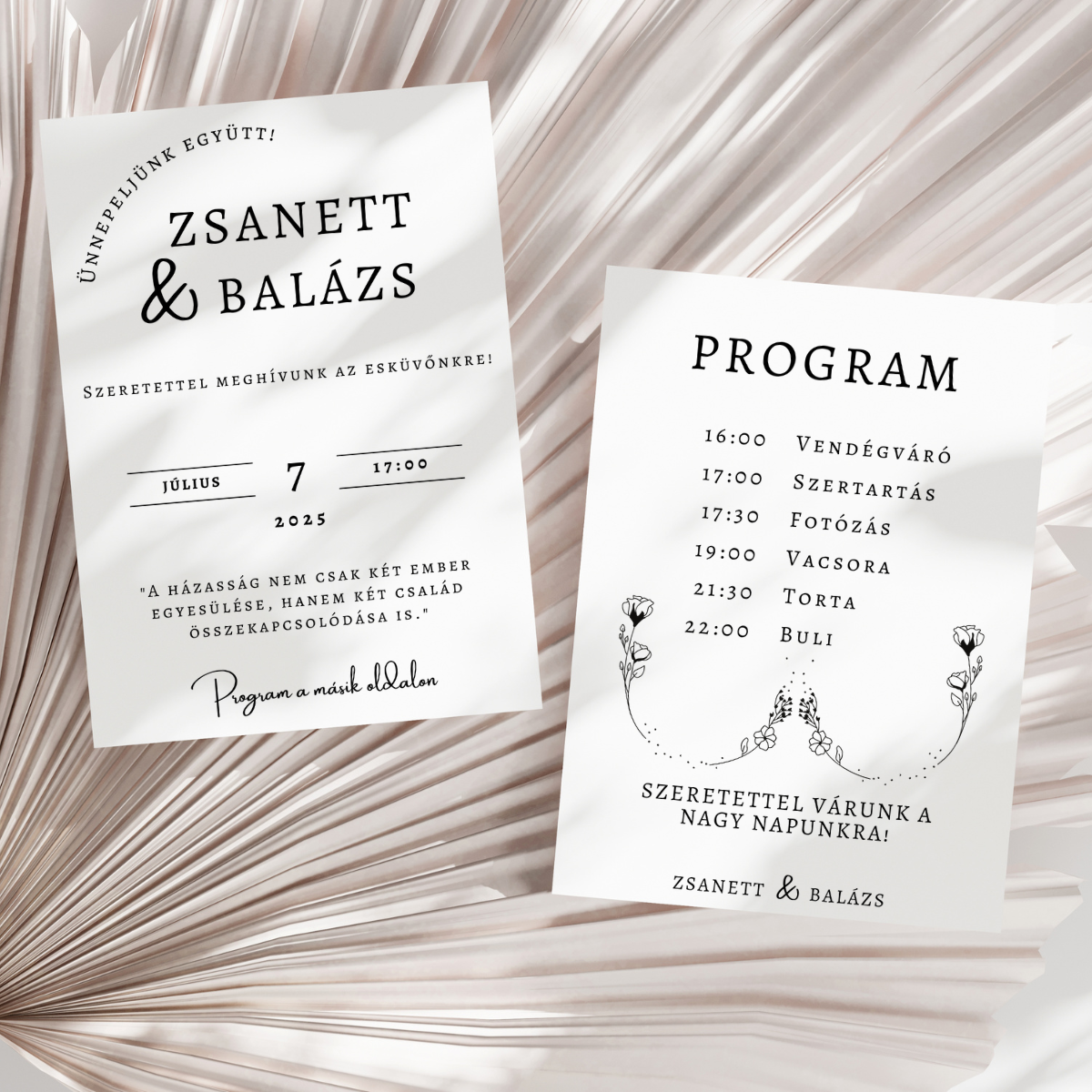 Ez a kétoldalas fekete-fehér esküvői meghívó eleganciát és minimalizmust sugároz, tökéletes választás azoknak a pároknak, akik a kifinomult egyszerűséget keresik. A letisztult design és a klasszikus színek elegánsan ötvözik a modern stílust a hagyományos szépséggel, miközben minden fontos esküvői információt tisztán és áttekinthetően közvetítenek.