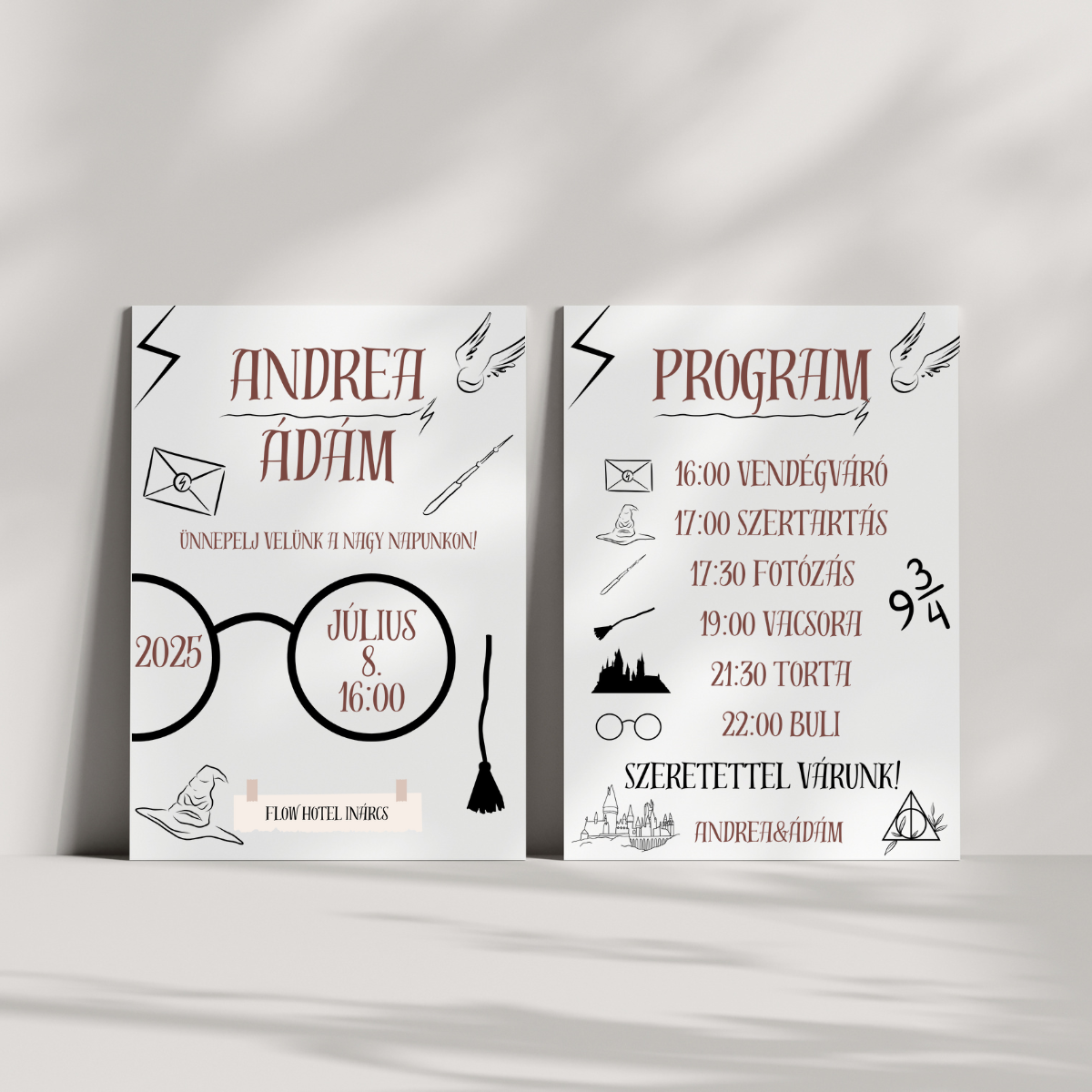 Varázslatos, kétoldalas meghívó, amely a Harry Potter világának hangulatát idézi. Tökéletes választás olyan pároknak, akik rajonganak a varázslatokért, és szeretnék, ha az esküvőjük egy mágikus érintéssel válna még különlegesebbé.