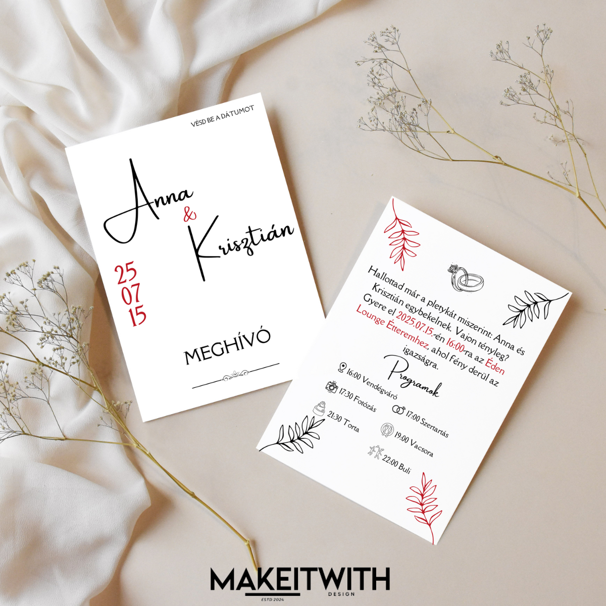 Meghívó (hajtott formában): Ez a design elkészíthető 4 oldalas, kinyithatós formában is, amelyre több szöveg, idézet vagy egyedi tartalom is elhelyezhető. Írjatok az info@makeitwith.hu email címre, és elküldjük a tervezetet!