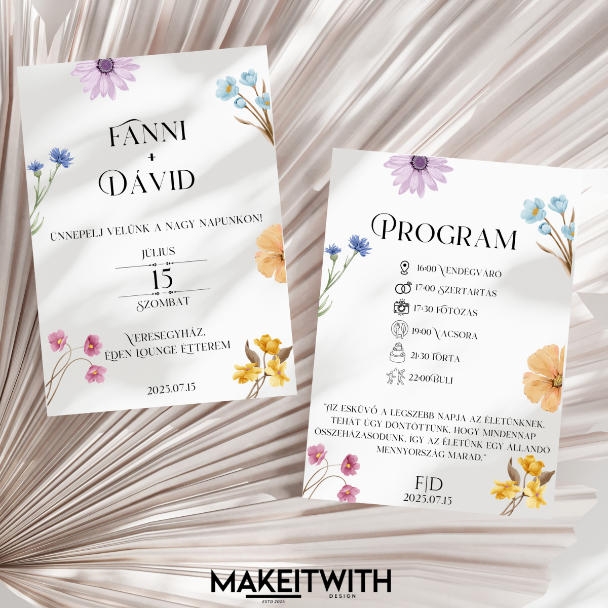 Vidám hangulatú, kétoldalas meghívó színes réti virágokkal, amely frissességet és természetességet sugároz. Tökéletes választás azoknak a pároknak, akik szeretnék, hogy meghívójuk is tükrözze a nagy nap örömét és könnyedségét.
