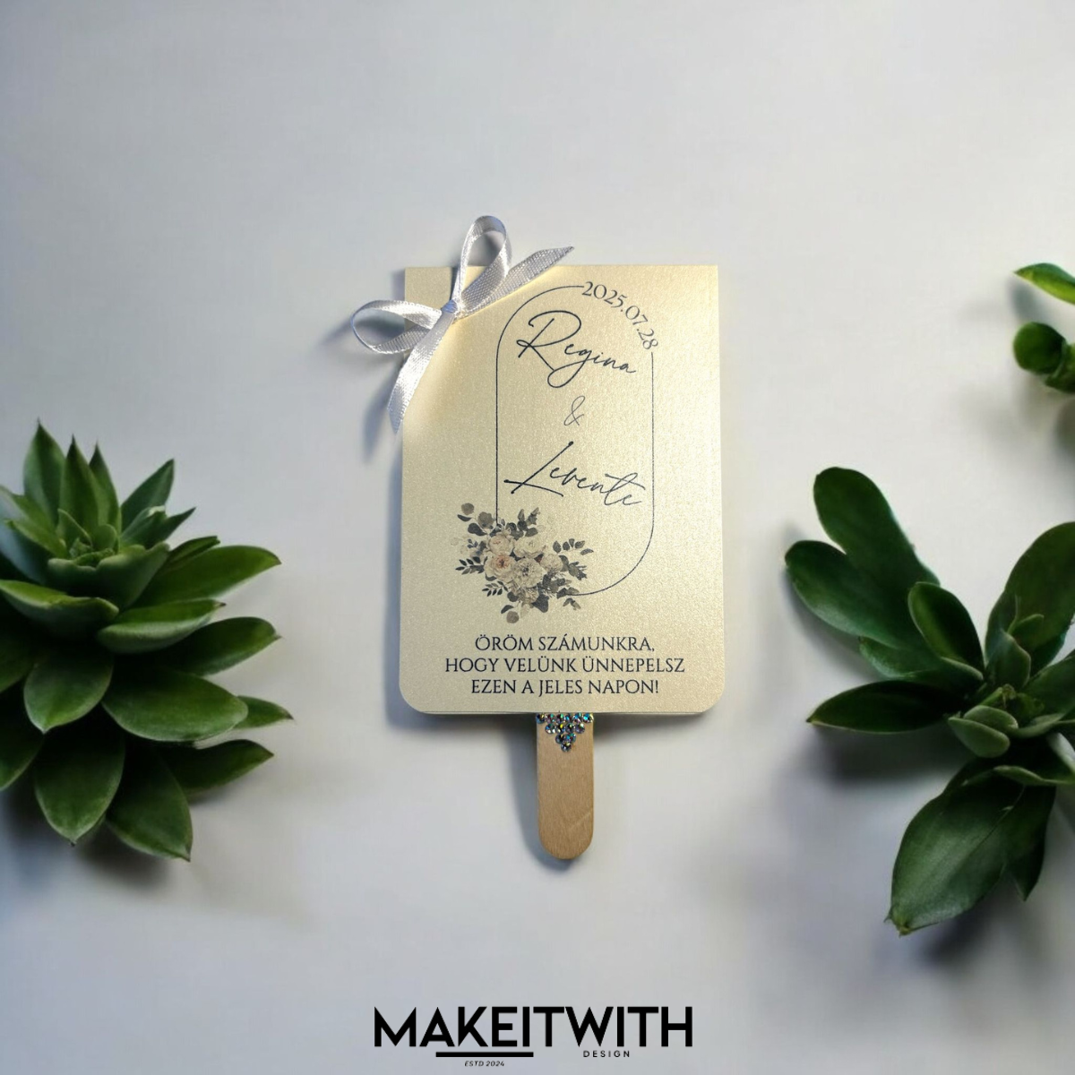 Ez az elegáns esküvői legyező nemcsak praktikus megoldás a nyári kültéri szertartásokra, de gyönyörű emlékként is megállja a helyét. Különleges díszítése és személyre szabható kialakítása miatt tökéletes kiegészítője lehet a nagy napnak.