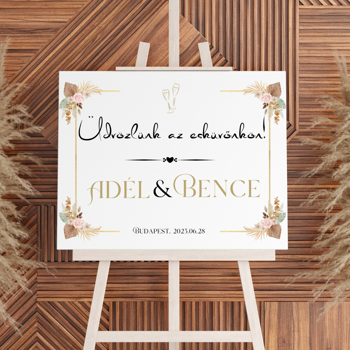 - Digitális esküvői üdvözlő tábla (70×50 cm)