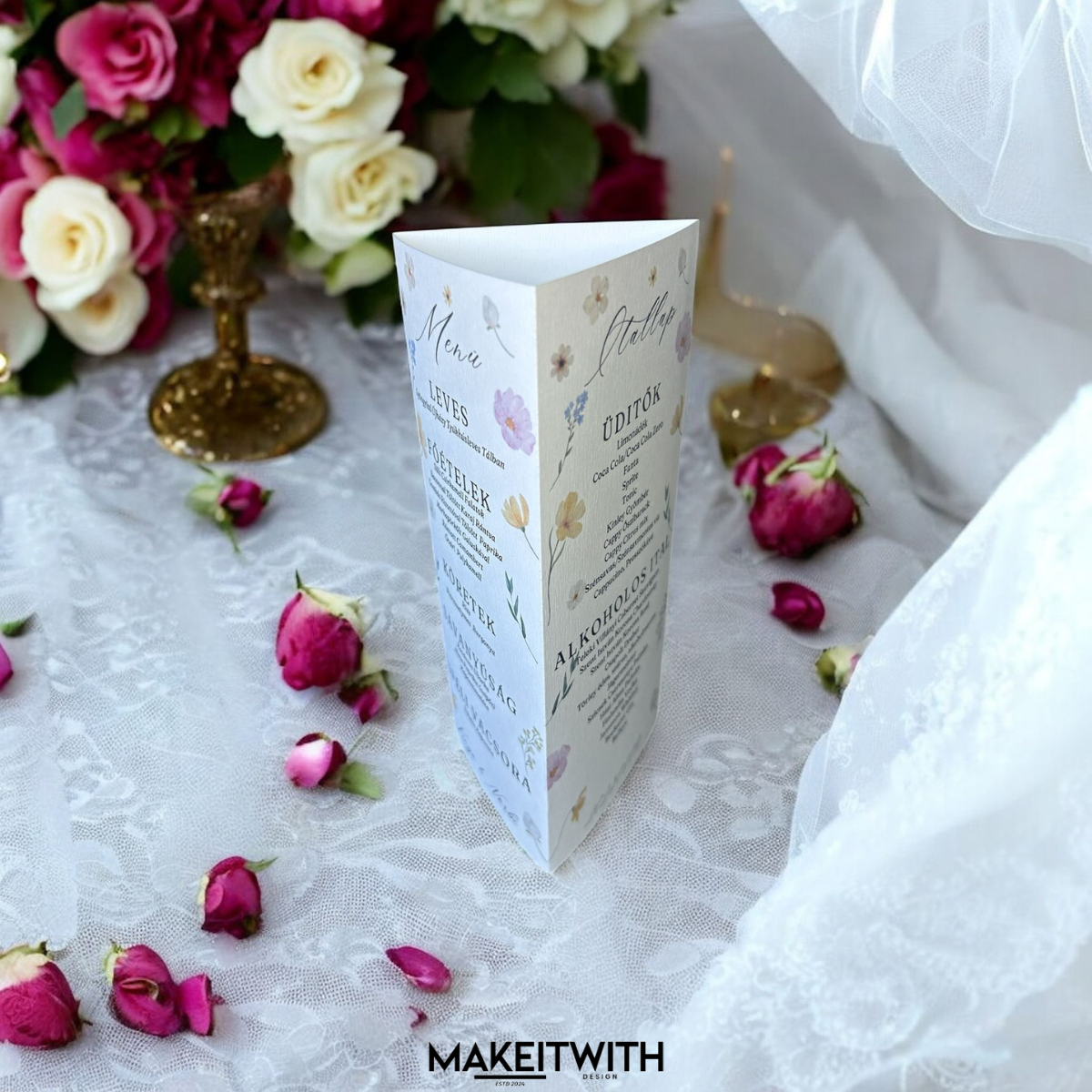 Háromszög alakú asztalszám, amely egyesíti az itallapot, menüt és asztalszámot egyetlen dekoratív formában. A dizájnt élénk, színes virágminták díszítik. Rózsák, bazsarózsák, margaréták és más kedvelt kerti virágok keveréke , friss, vidám hangulatot sugározva. A részletgazdag, harmonikus elrendezés romantikus és természetközeli esküvőkhöz, tavaszi–nyári dekorációhoz tökéletes választás.