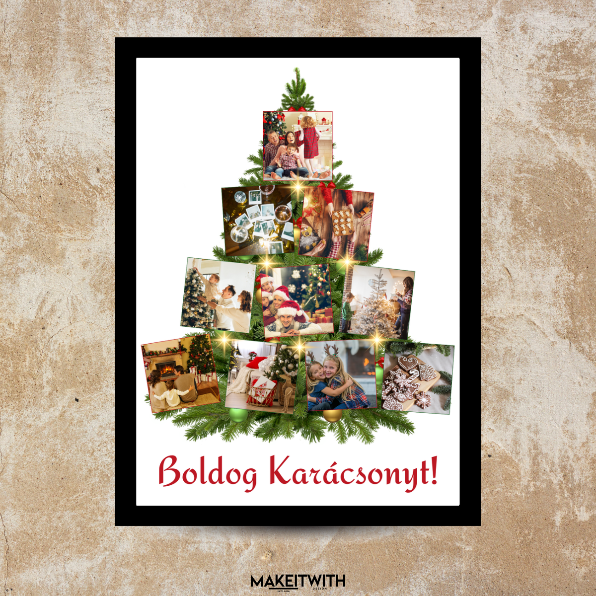 A kollázs karácsonyfa formában rendezett 10 darab saját fotót tartalmaz, melyek a meghitt pillanatokat, közös nevetéseket és ünnepi emlékeket elevenítik fel. A kompozíciót egy arany csillag és a „Boldog Karácsonyt!” felirat teszi teljessé, hogy még melegebb hangulatot árasszon.