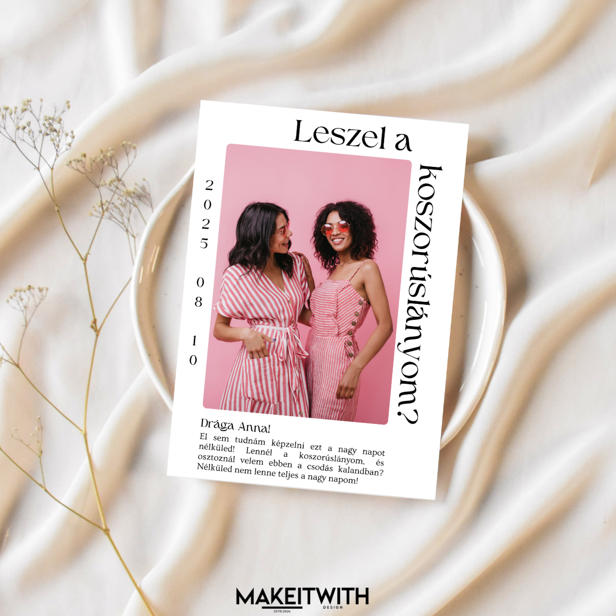 Tedd felejthetetlenné a koszorúslányod felkérését ezzel a személyre szabott, egyedi képes felkérővel! A minimalista, mégis elegáns dizájn tökéletesen kifejezi a meghitt pillanat fontosságát.