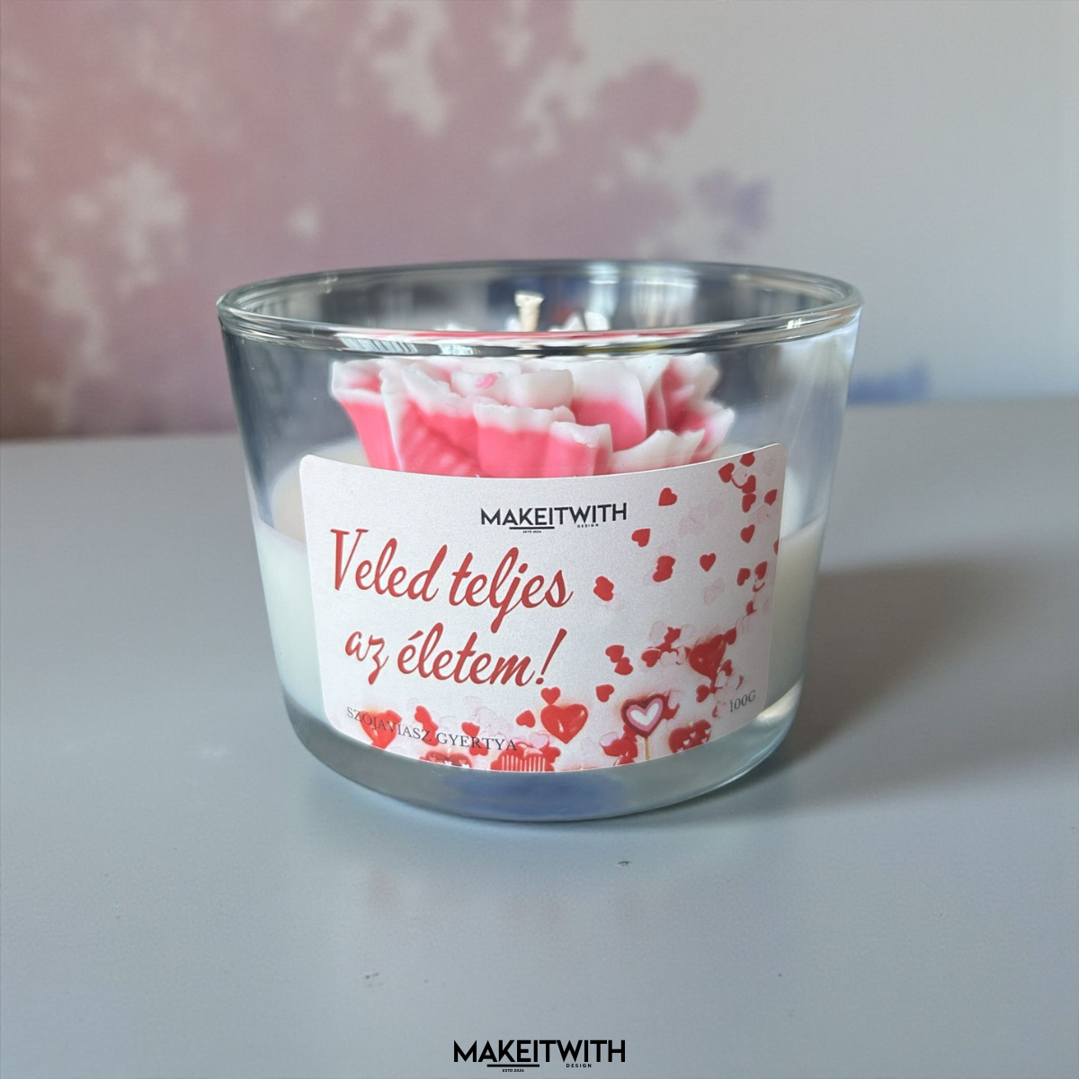 A gyertya letisztult üvegpohárban érkezik, amelyet egy szeretetteljes üzenet díszít: