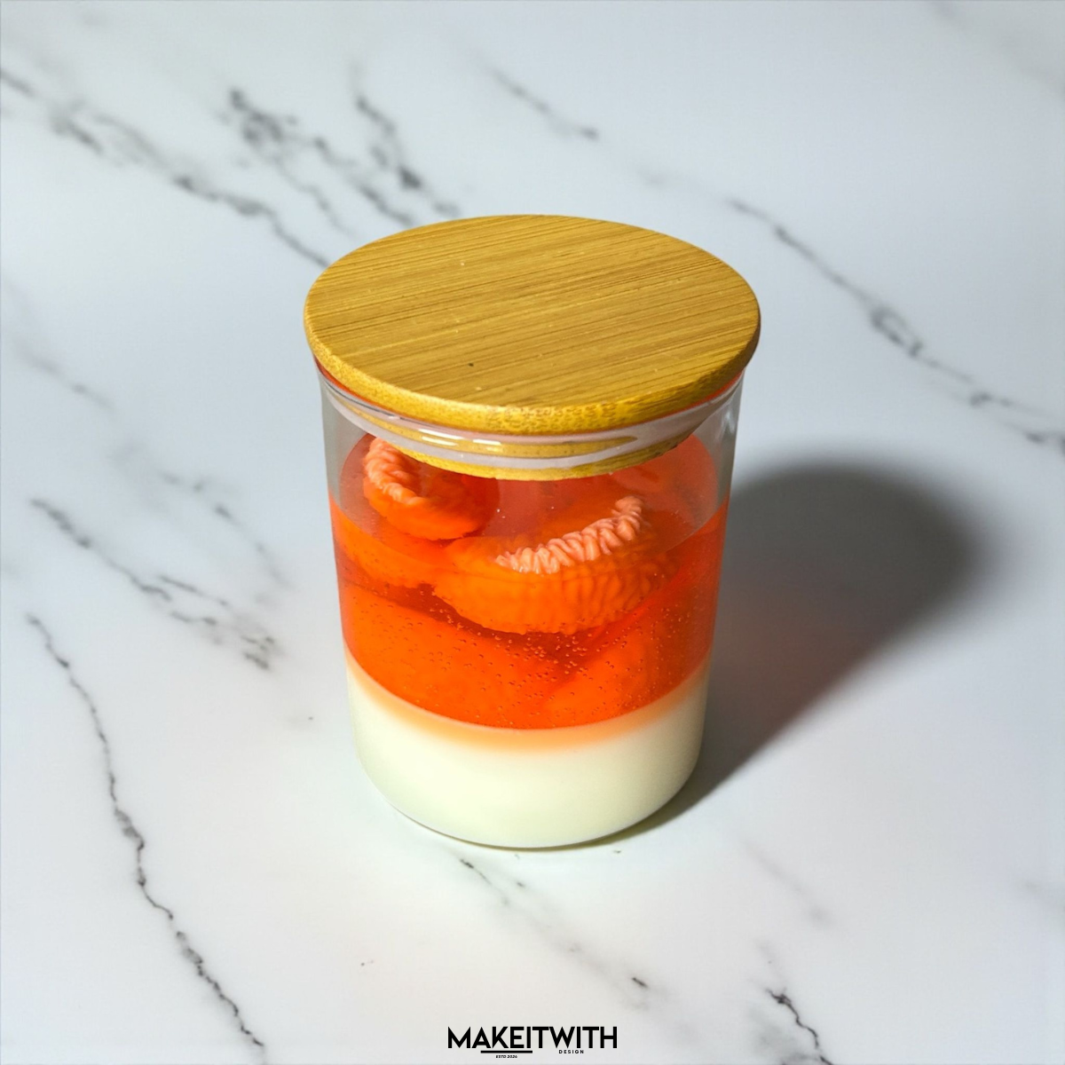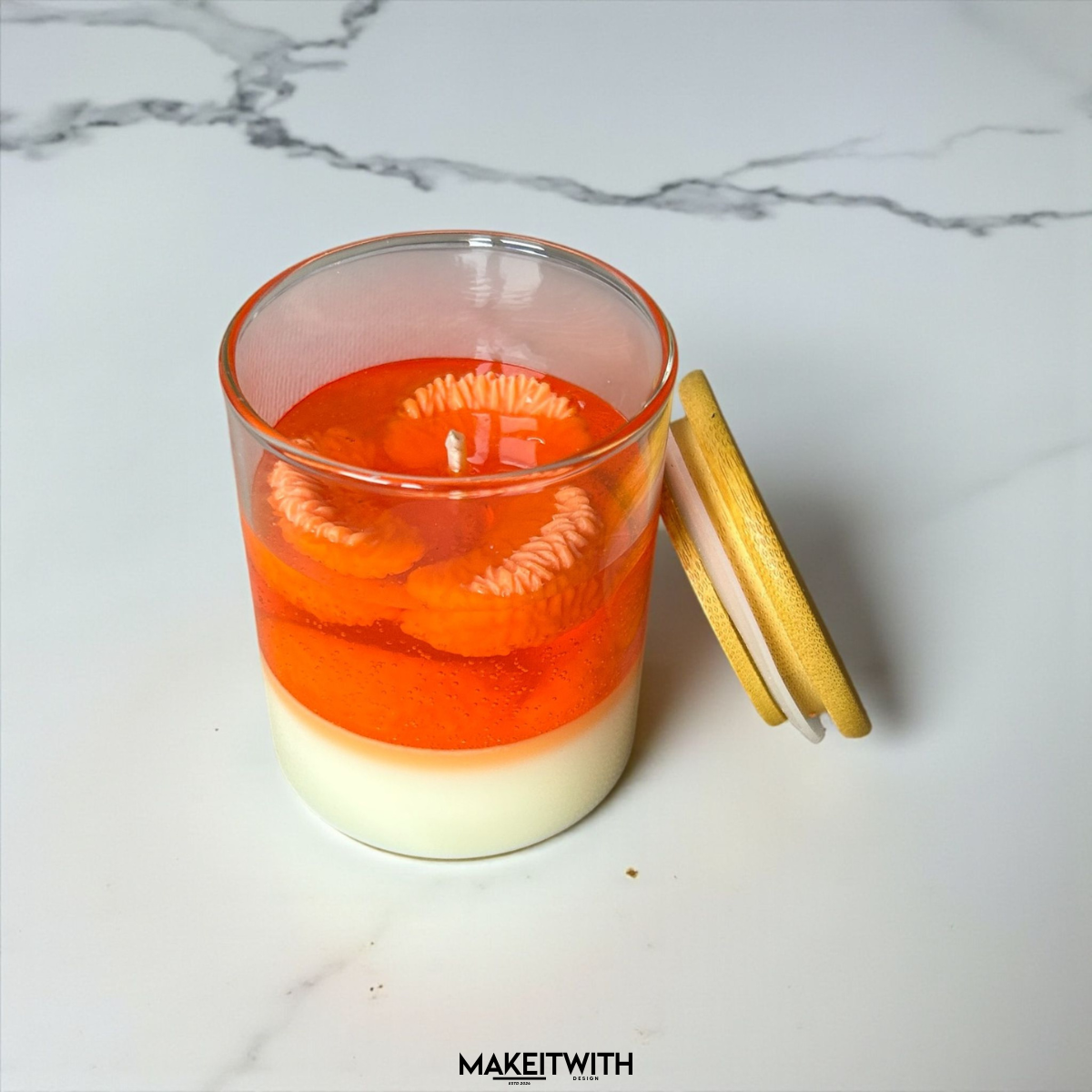 A gyertya természetes szójaviaszból és áttetsző gyertyazseléből készül, látványos rétegezéssel. A zselés részben mandarin darabok kaptak helyet, melyek nemcsak gyönyörűen mutatnak, de még különlegesebbé teszik az összhatást.