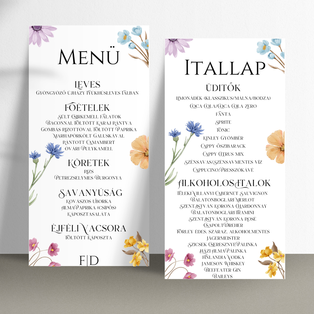 Vidám, színes réti virágos esküvői menükártya, amely frissességet és természetességet sugároz. Tökéletes választás azoknak a pároknak, akik szeretnék, hogy esküvőjük minden részlete harmóniát és könnyedséget tükrözzön.