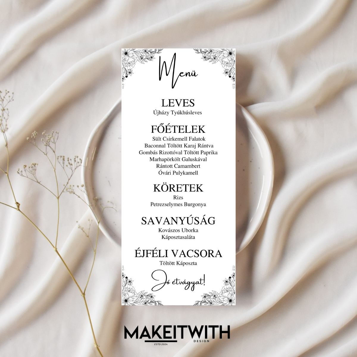 Menükártya – Fekete & Fehér Virágos