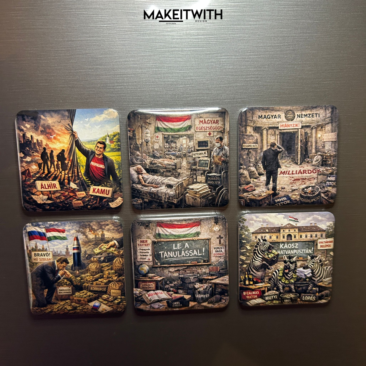 Ez a 6 darabos mágnes szett azoknak készült, akik szeretik, ha a reggeli kávé mellé jár egy csipetnyi… aktuálpolitikai ihletésű realizmus. Finoman fogalmazva.