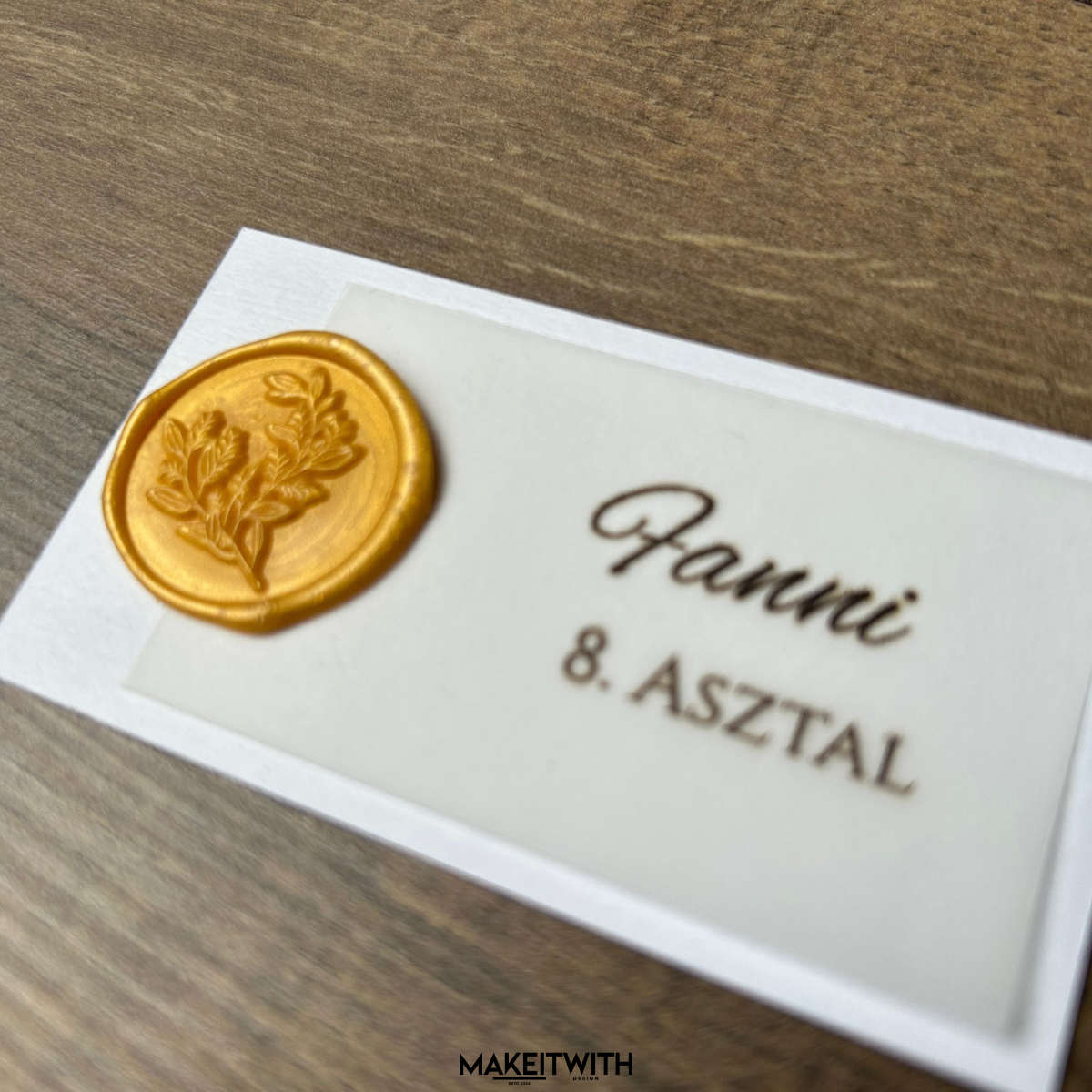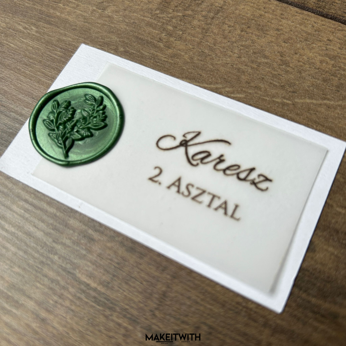 A kártya alapja prégelt lap (9×5 cm), amely finom textúrát és prémium hatást biztosít. Az összképet egy stílusos viaszpecsét emeli ki, amely két gyönyörű színben érhető el: