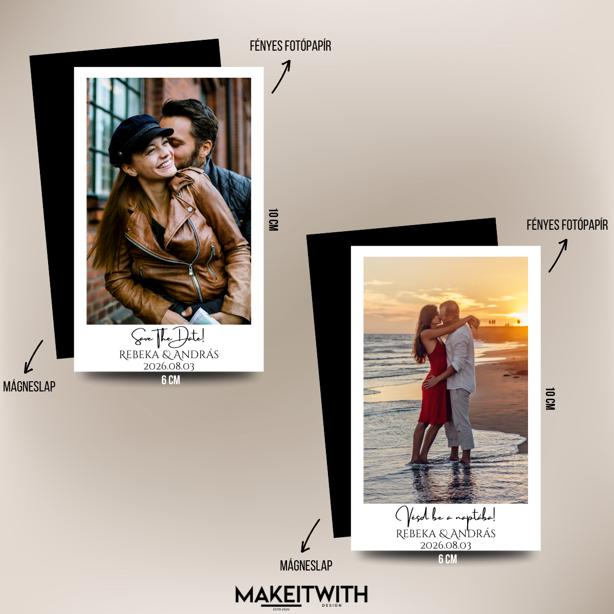 Tedd még különlegesebbé az esküvőtök bejelentését a Save The Date vagy Vésd be a naptárba hűtőmágnessel! Tökéletes kiegészítő a meghívótokhoz, vagy önálló ajándékként is remek meglepetés a vendégek számára.