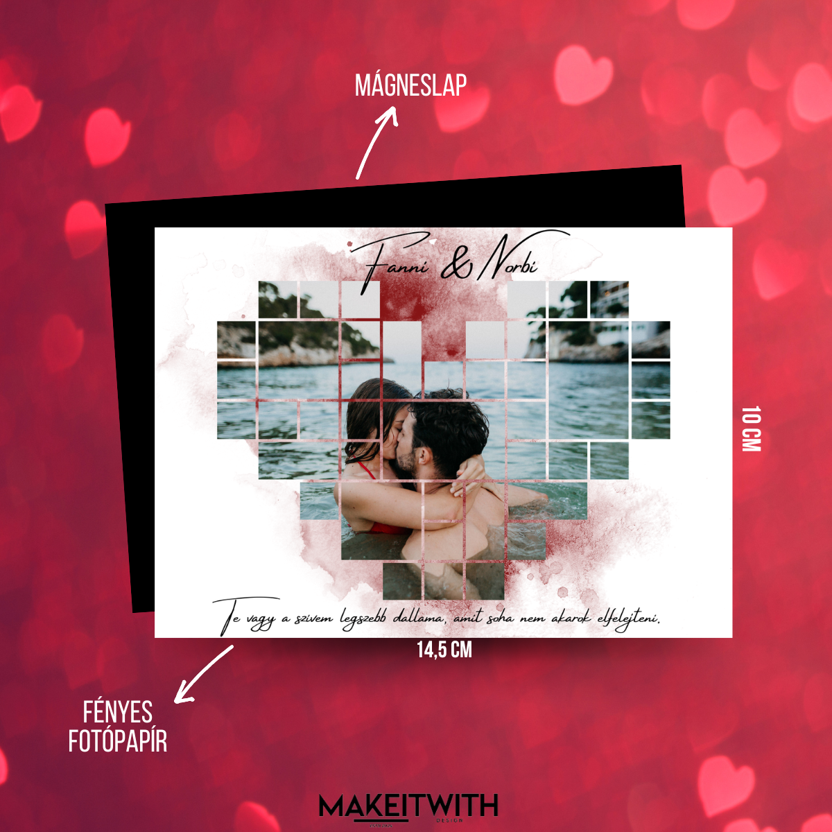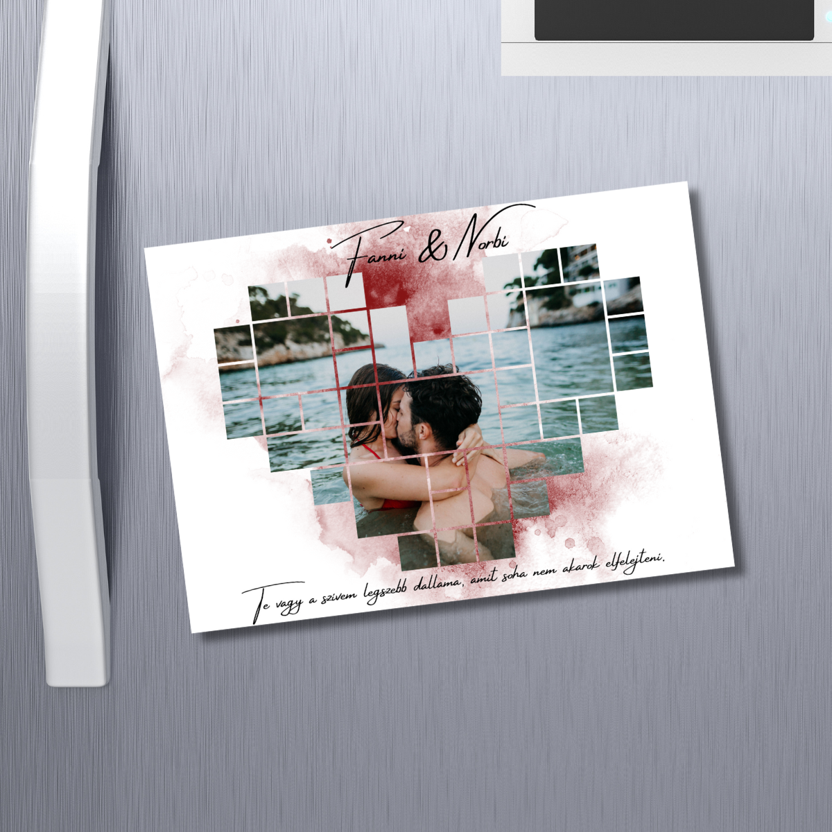 Lepd meg szerelmedet egy különleges ajándékkal: ez a szív alakú, 14,5 x 10 cm-es mágnes nemcsak a kedvenc közös fotótokat örökíti meg, hanem a legkedvesebb szerelmes idézetetek is rajta lesz! 💖