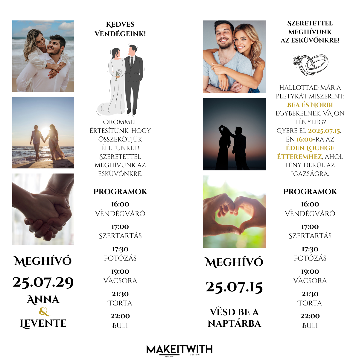 • Második oldal: Az esküvő legfontosabb információit tartalmazza, rendezett és áttekinthető formában (200g Copy Color karton)