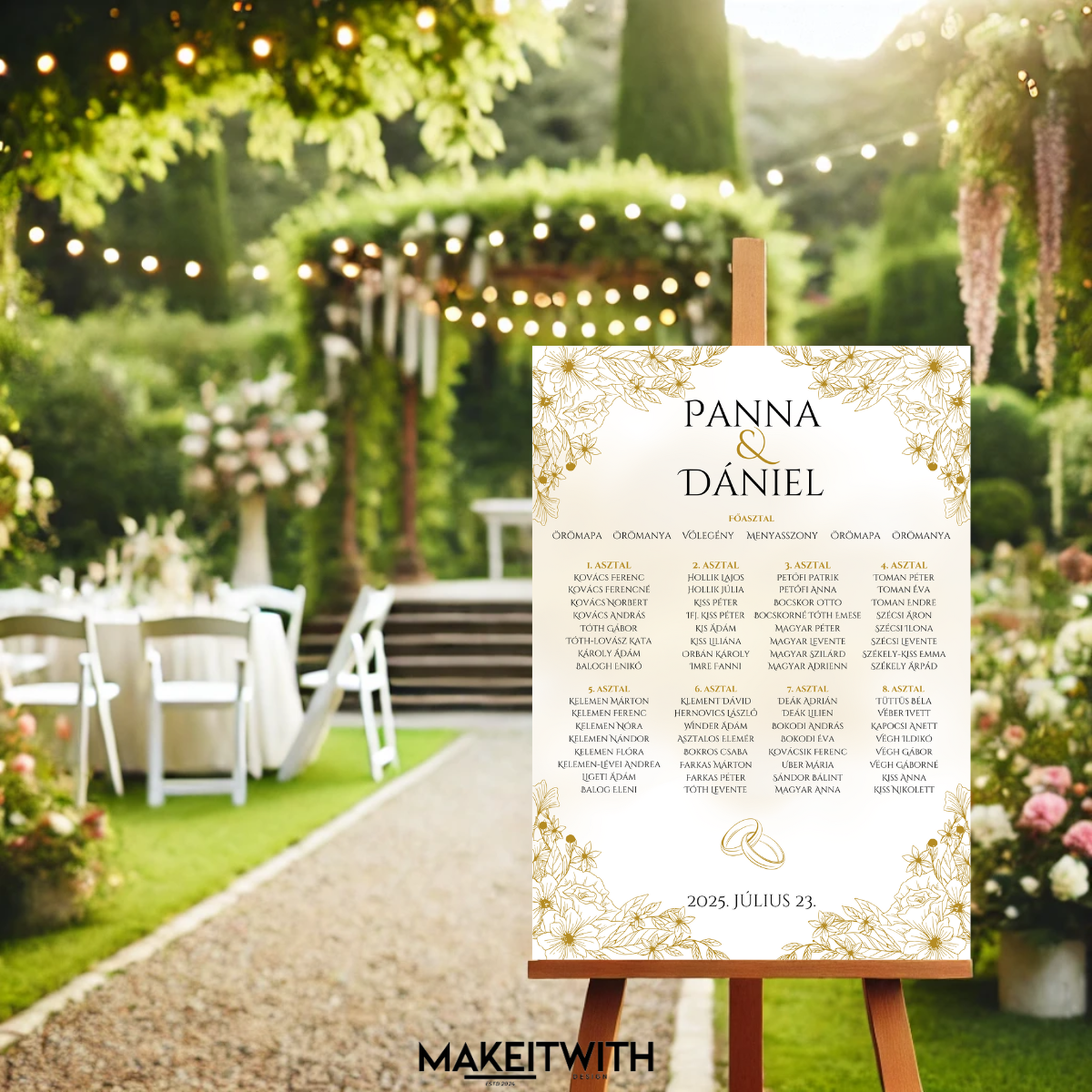 Ez az ültetőtábla finom arany virágmintával díszített, amely tökéletes választás egy elegáns és klasszikus esküvőhöz.