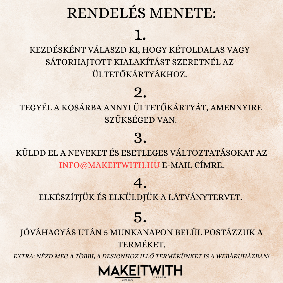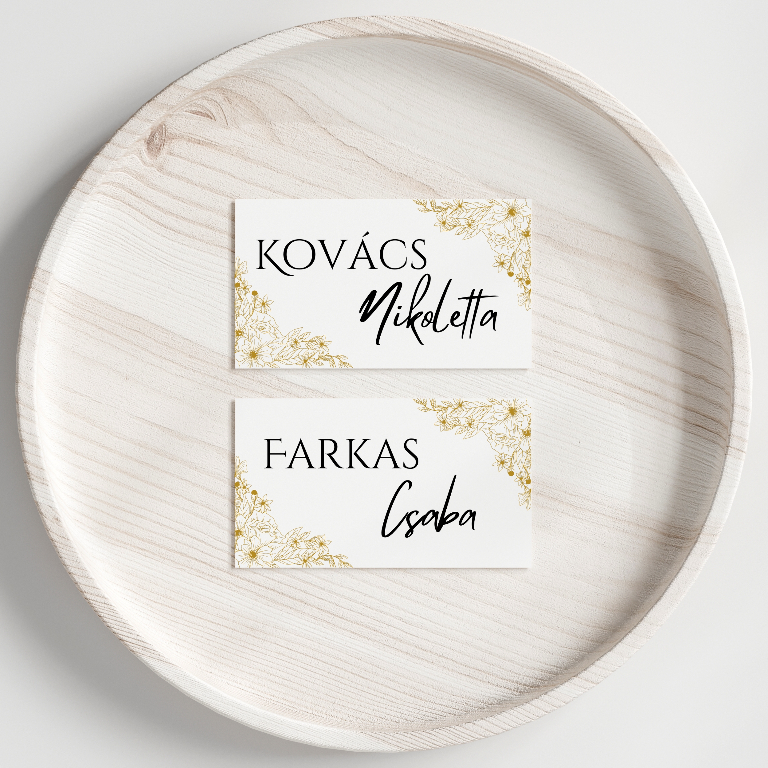 • Kialakítás: Egyedi, előre nyomtatott nevekkel ellátott ültetőkártya