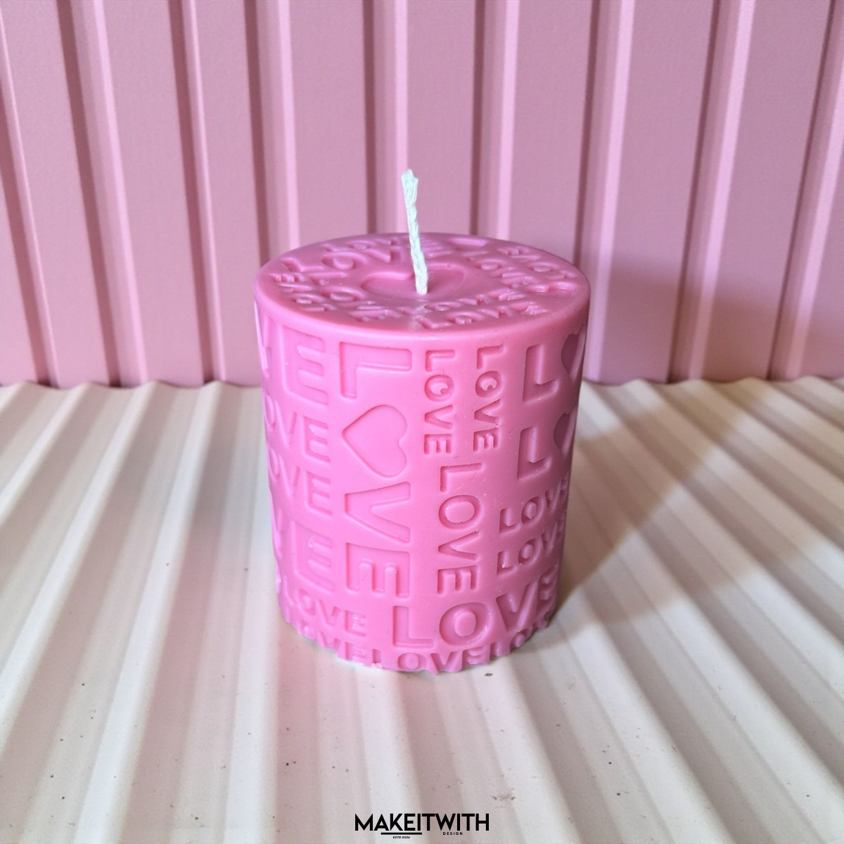 Ez a bájos, rózsaszín illatviasz gyertya természetes szójaviaszból készült, oldalát körben romantikus „LOVE” feliratok és szívmotívumok díszítik. Megjelenése önmagában is dekoratív, igazi különleges darab. 💗✨