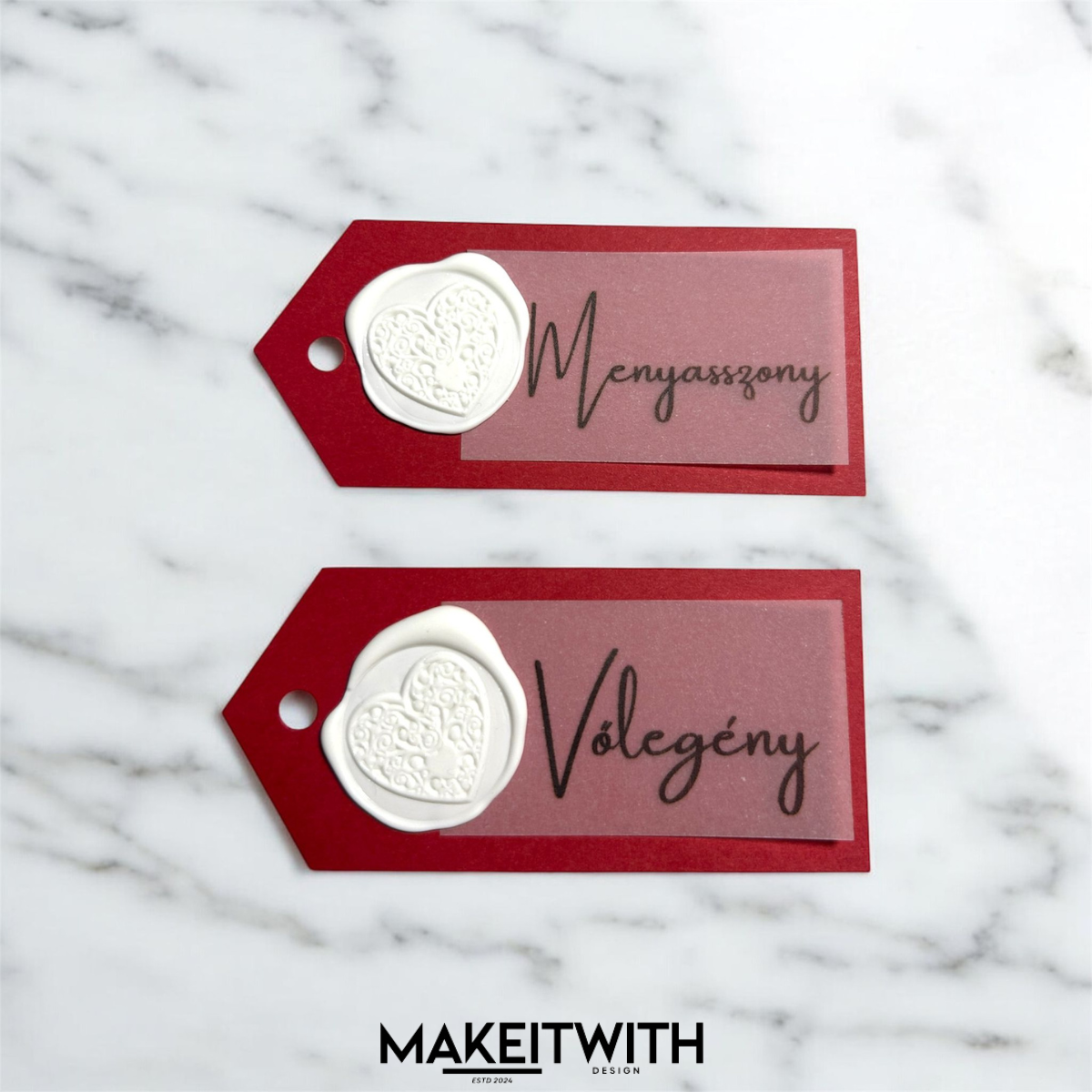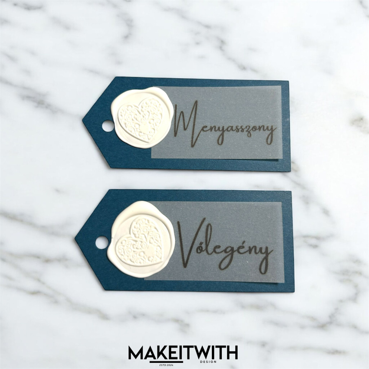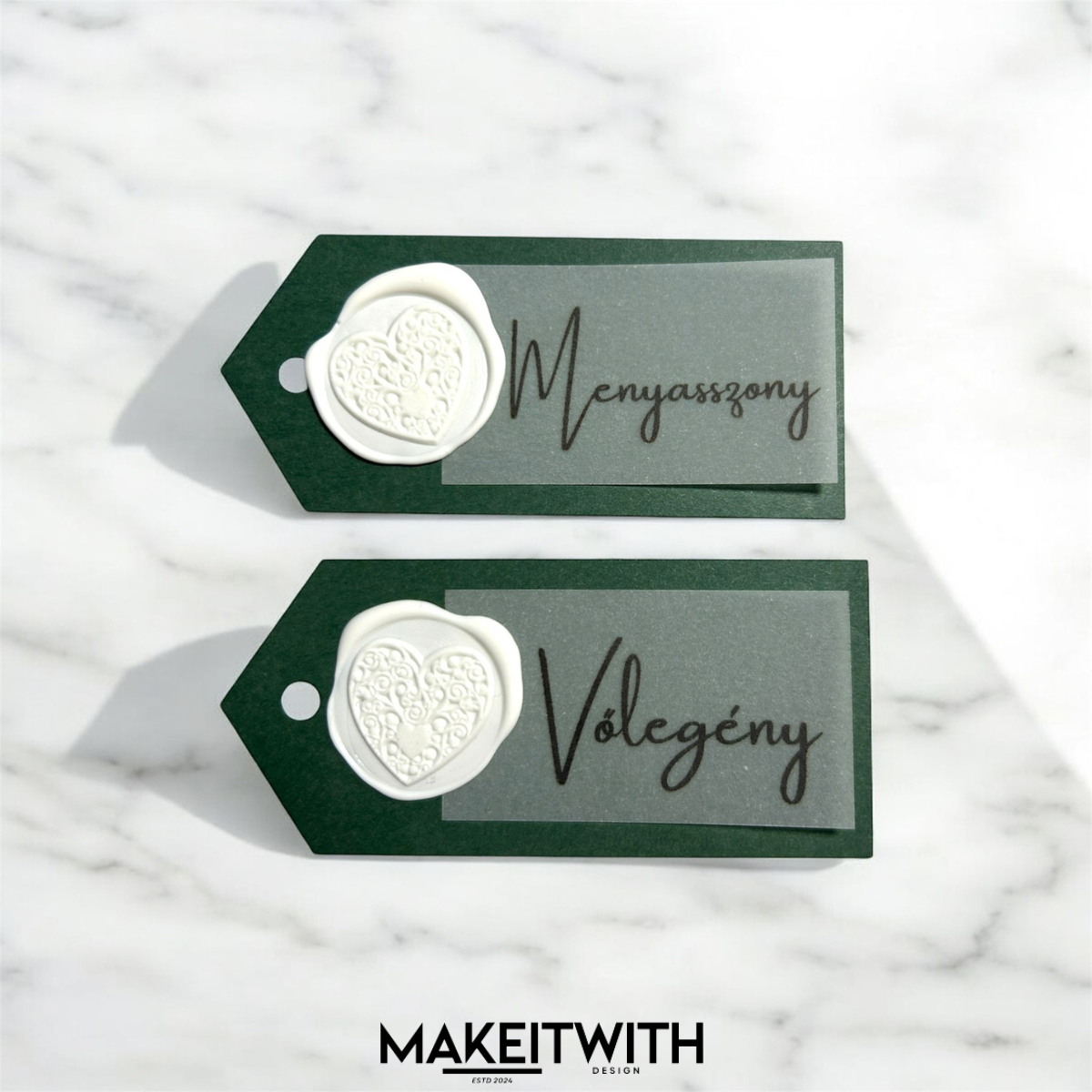 - Elegáns díszítés: A kártyát fehér, szív alakú viaszpecsét koronázza meg, mely egyedi és kifinomult megjelenést kölcsönöz.
