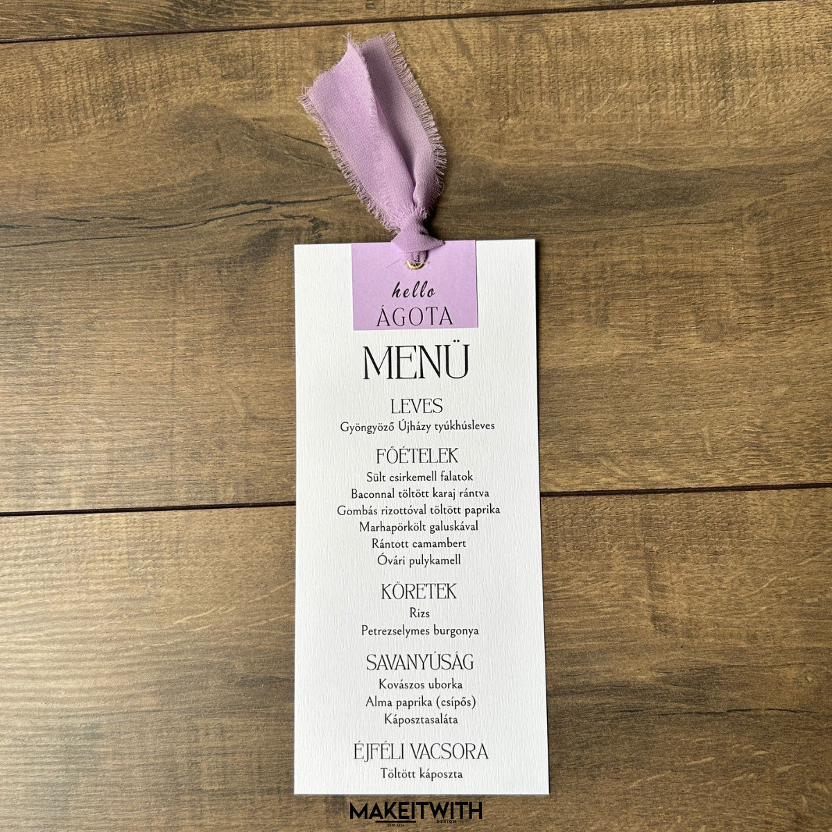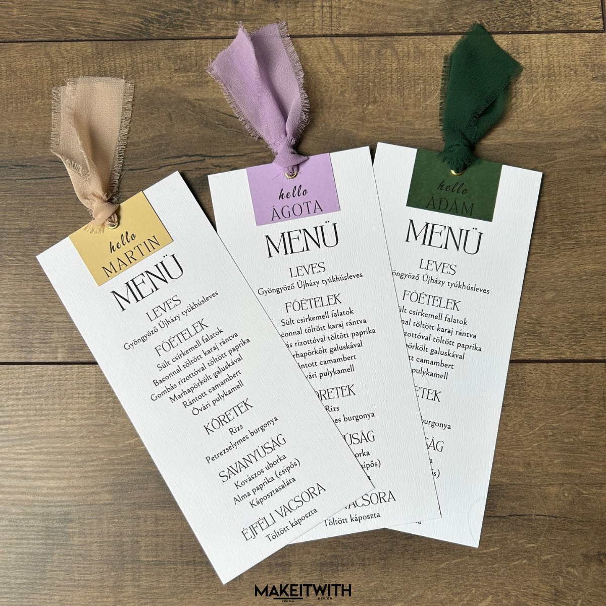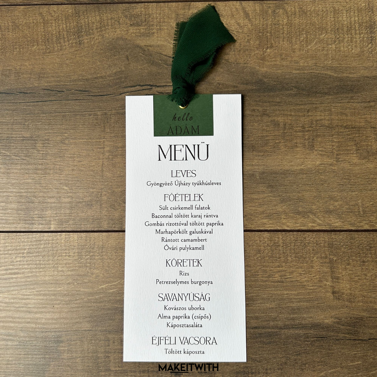A menükártya tetején egy színes karton betét található (smaragdzöld, lila, bézs), amelyen egy kedves üdvözlés és a vendég neve szerepel, kifinomult tipográfiával. Ezáltal a kártya egyszerre szolgál menüként és ültetőkártyaként, így személyre szabott asztali díszként is funkcionál.