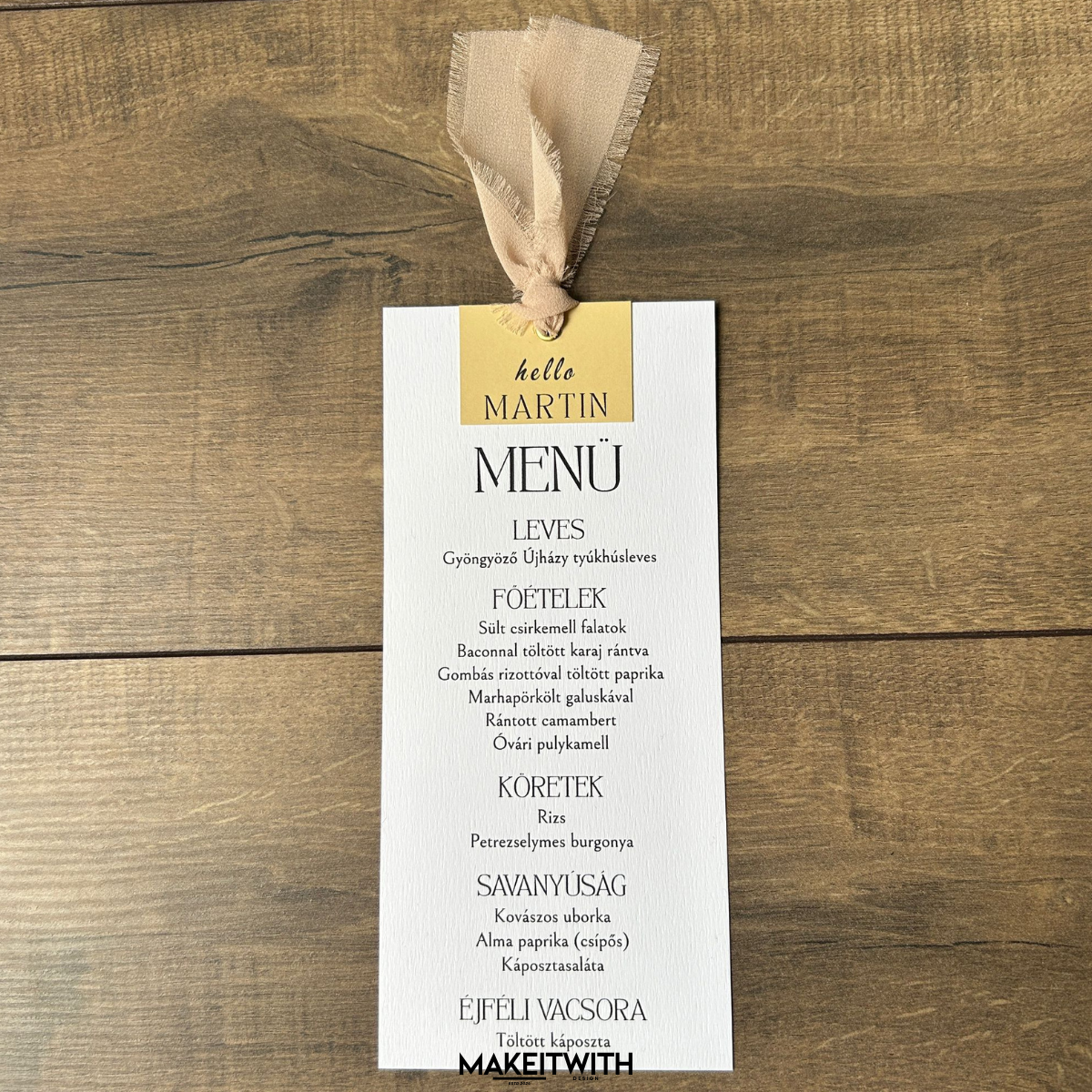 Ez a menükártya nem csupán az ételsor bemutatására alkalmas, hanem az esküvői dekoráció egyik kiemelt eleme is, amely tökéletesen illeszkedik az ünnepi asztal elegáns összképébe.